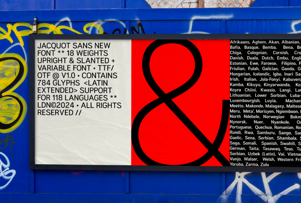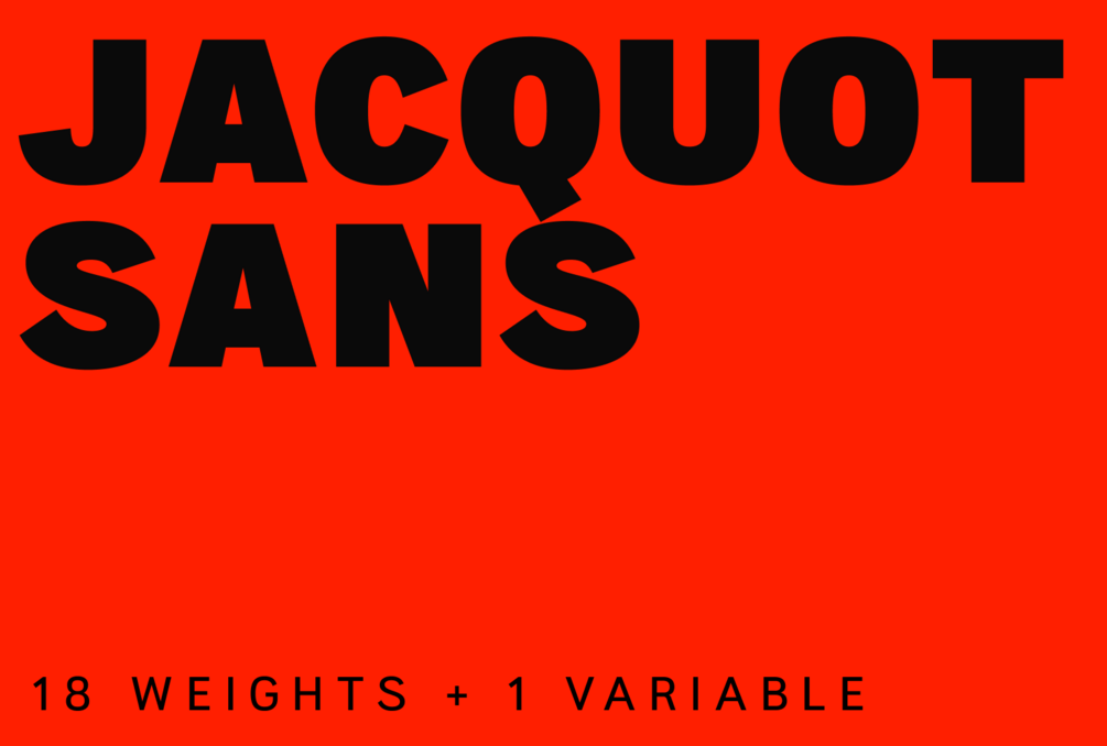 Jacquot is a contemporary, geometric sans serif with humanist inspirations. Jacquot Sans offers 18 weights and obliques ranging from Extralight through Black plus a variable version giving it a lot of flexibility to be used as body or display. Its slightly condensed shape creates impactful titles as well as a balanced body.